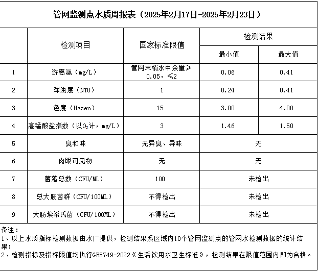 管網(wǎng)監(jiān)測點(diǎn)水質(zhì)周報(bào)表(2025年2月17日-2025年2月23日)