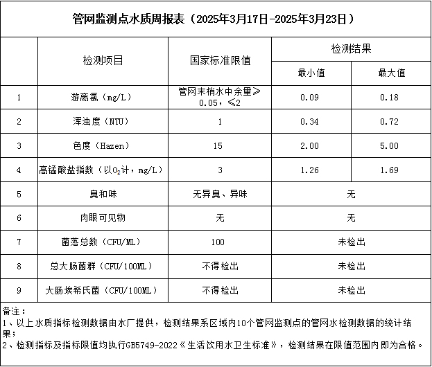 管網(wǎng)監(jiān)測點(diǎn)水質(zhì)周報表(2025年3月17日-2025年3月23日)