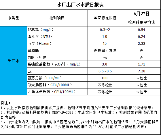 水廠出廠水水質(zhì)日?qǐng)?bào)表(2025-5-27)