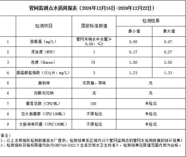管網監(jiān)測點水質周報表(2024年12月16日-2024年12月22日)